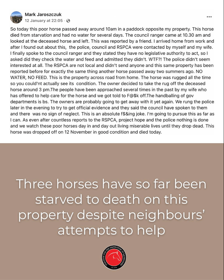 “This horse died from starvation and had no water for several days. The council ranger admitted they didn’t check water or feeding. The police didn’t seem interested. The RSPCA didn’t attend. This same property has been reported before after another horse died two summers ago — again, no water, no feed.”